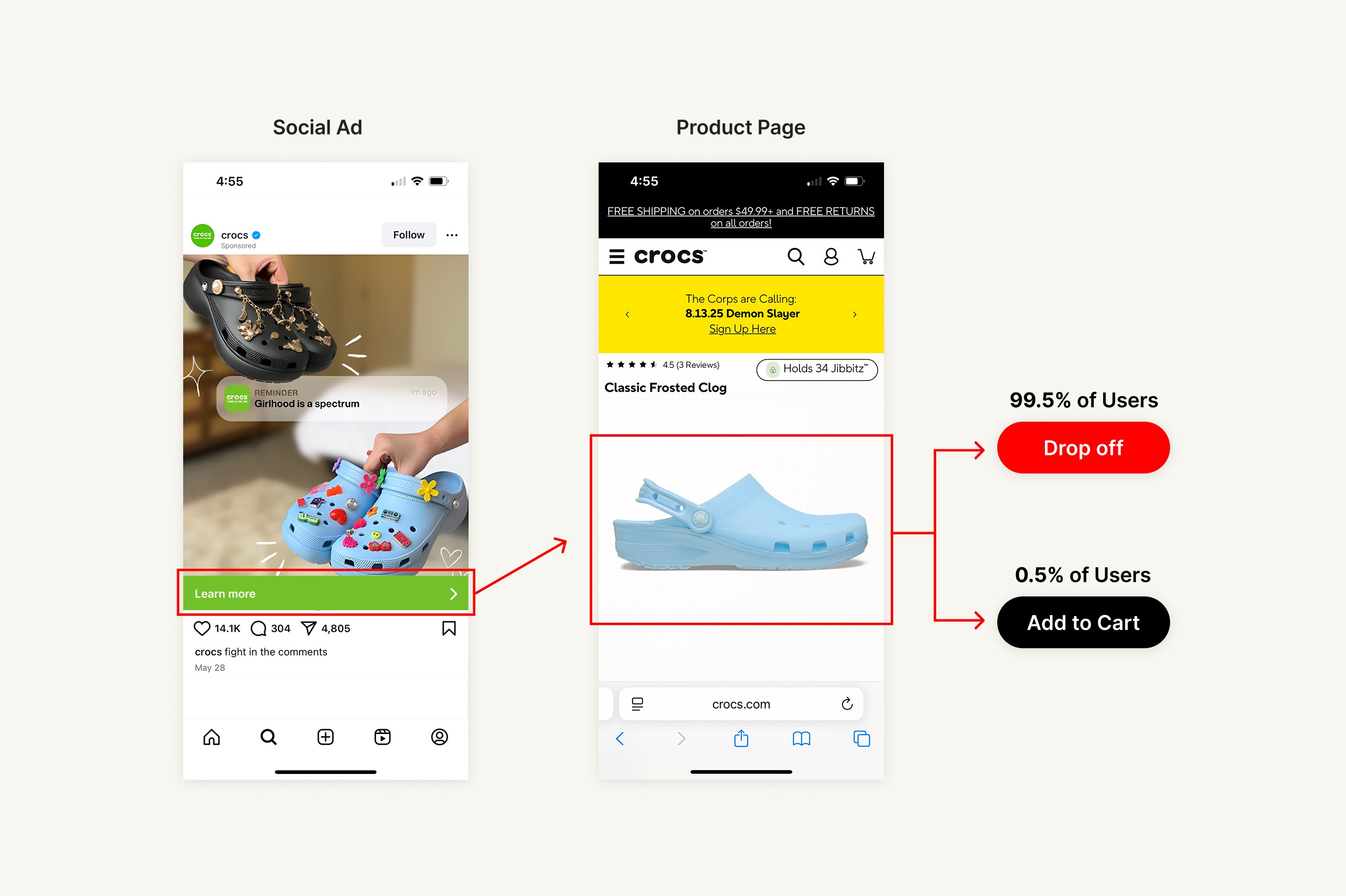 Crocs' paid social ads are a key driver of sales, but the click-through journey was broken. Sending users straight from an ad to a standard product page caused high drop-off and low conversion. Without continuity or personalization, customers abandoned the funnel.