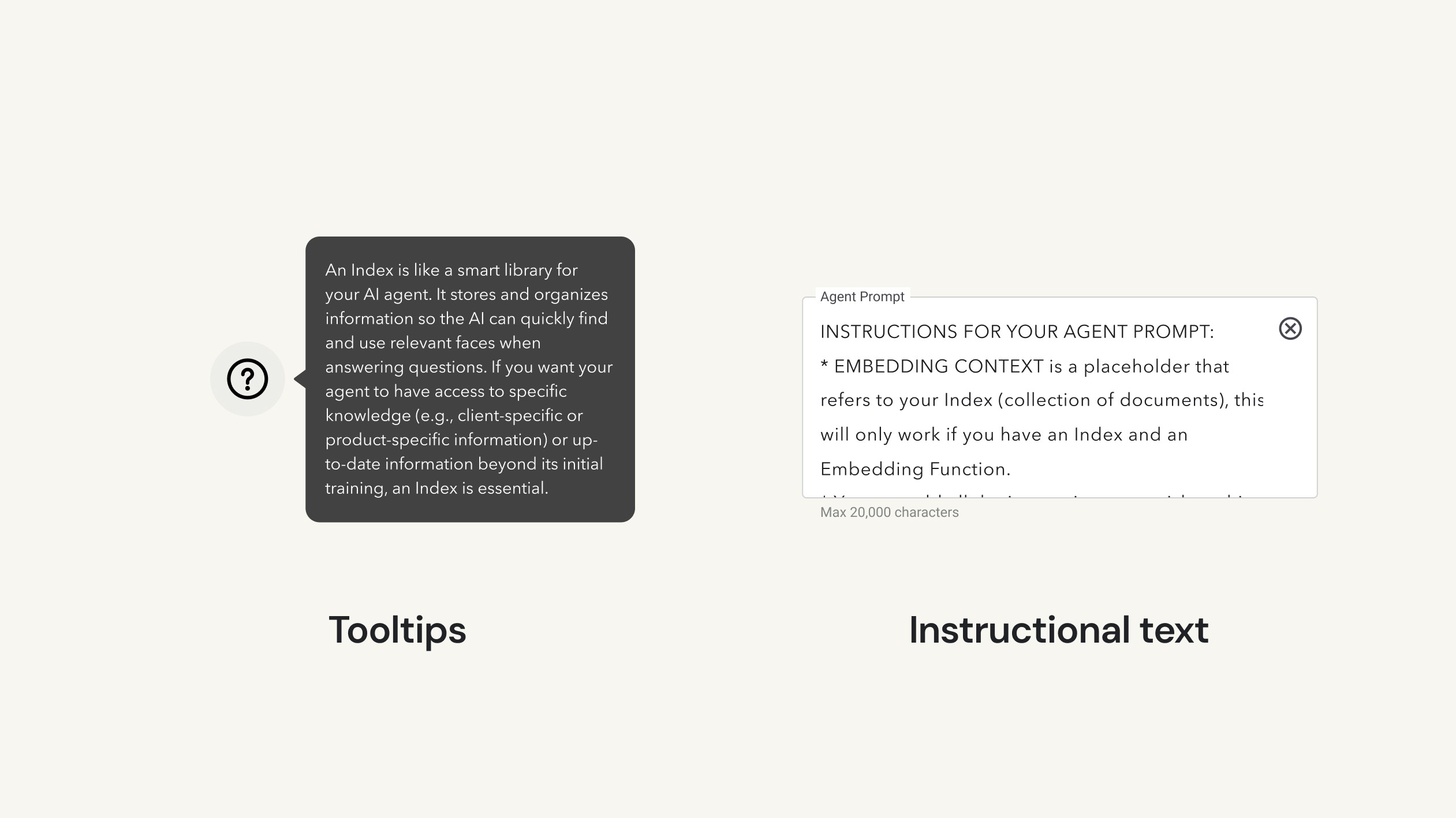 Tooltips and instructional text increased comprehension around the agent creation process.