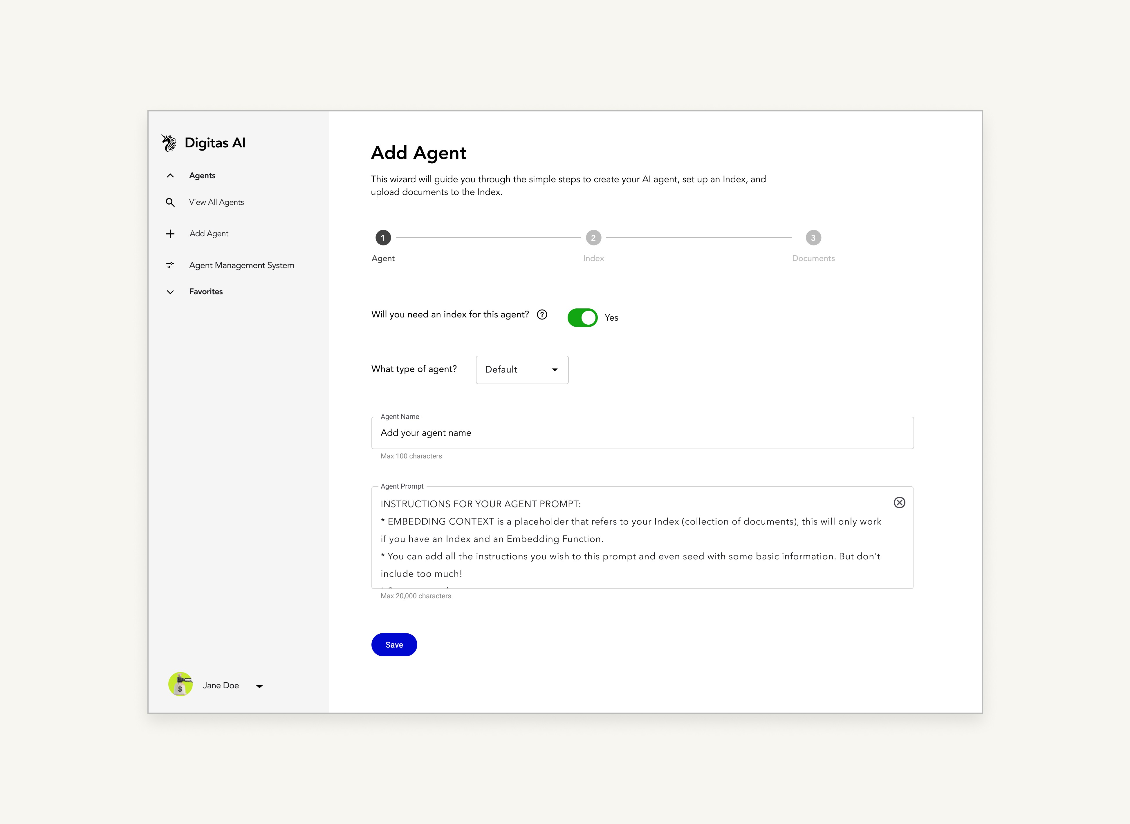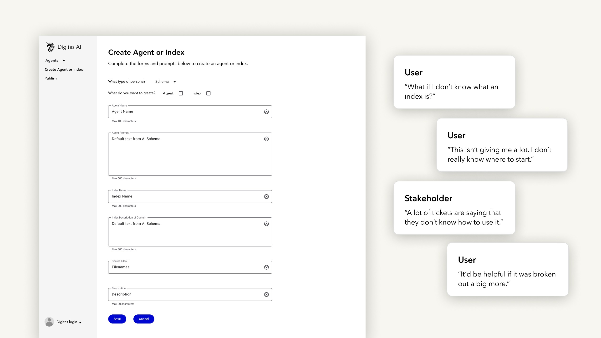 DigitasAI is an internal platform with a suite of AI tools for professionals. One of its most-used capabilities is creating custom AI agents through the “Add Agent” feature. But the original single-screen interface was overwhelming with unclear steps, heavy technical jargon, and no sense of progress.