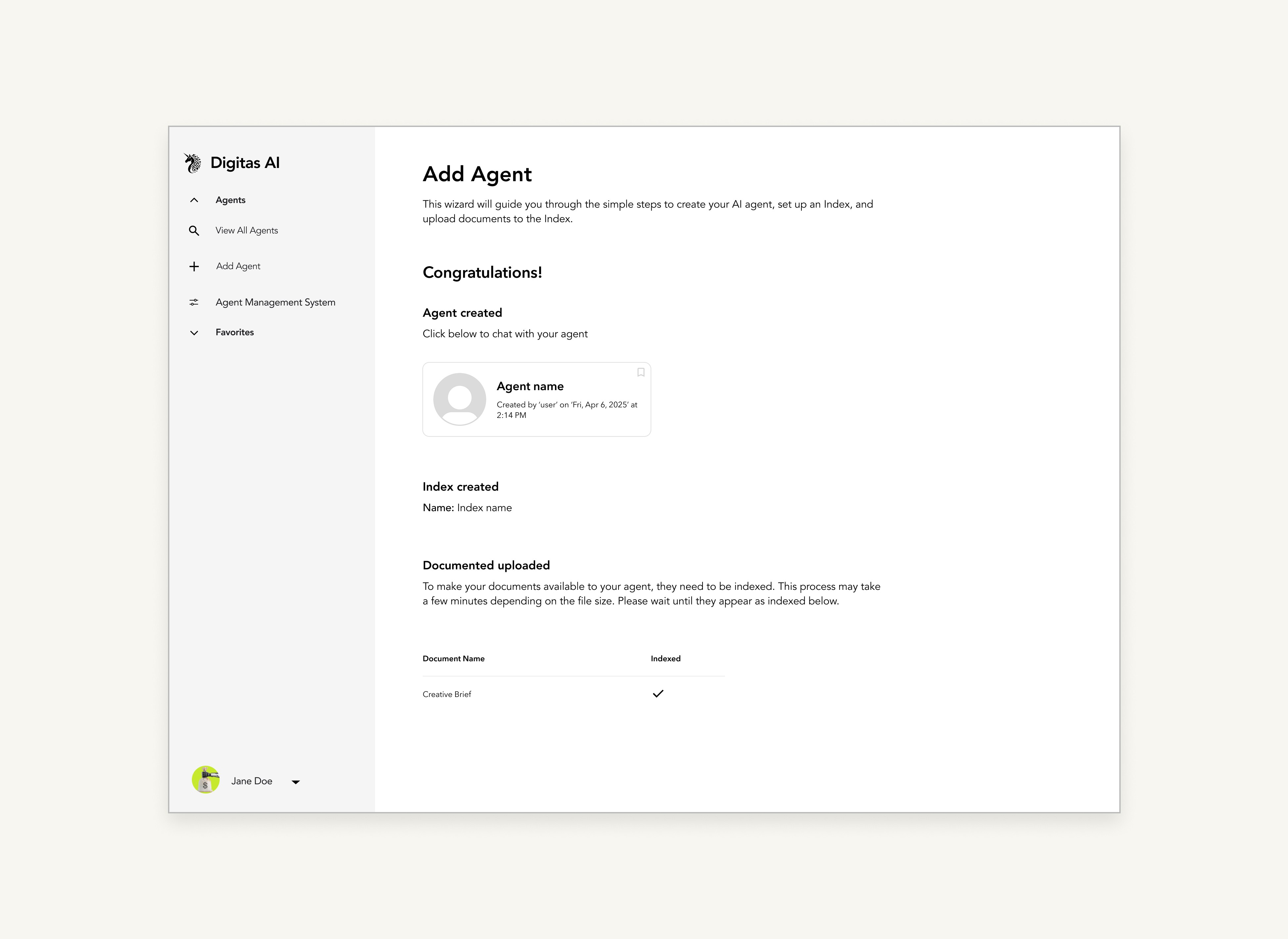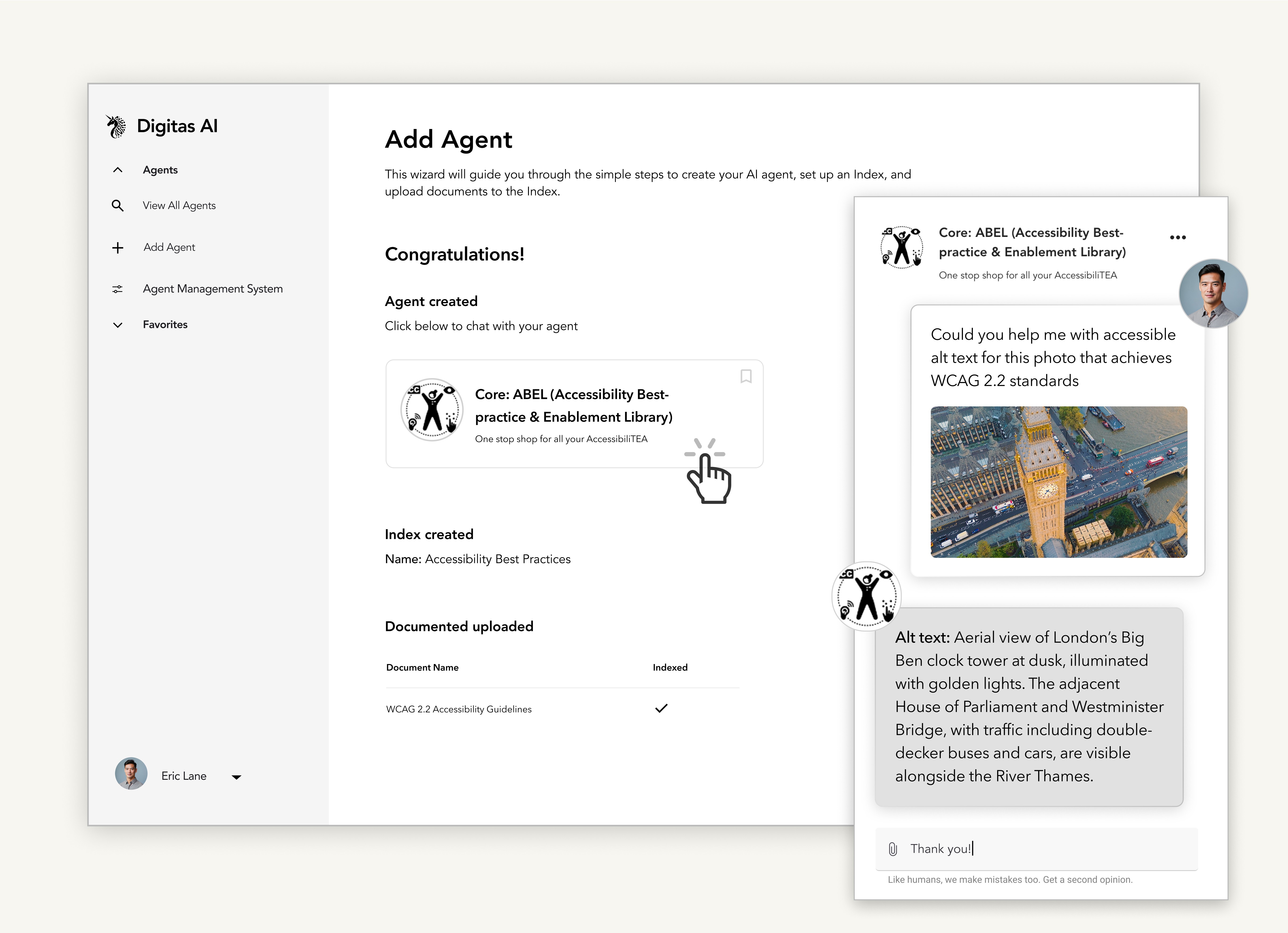 DigitasAI's core capability, creating custom AI agents, had low adoption. I led the research, design, and delivery of an improved workflow for agent creation. Leading to increased feature adoption, task success, and reduced support tickets.