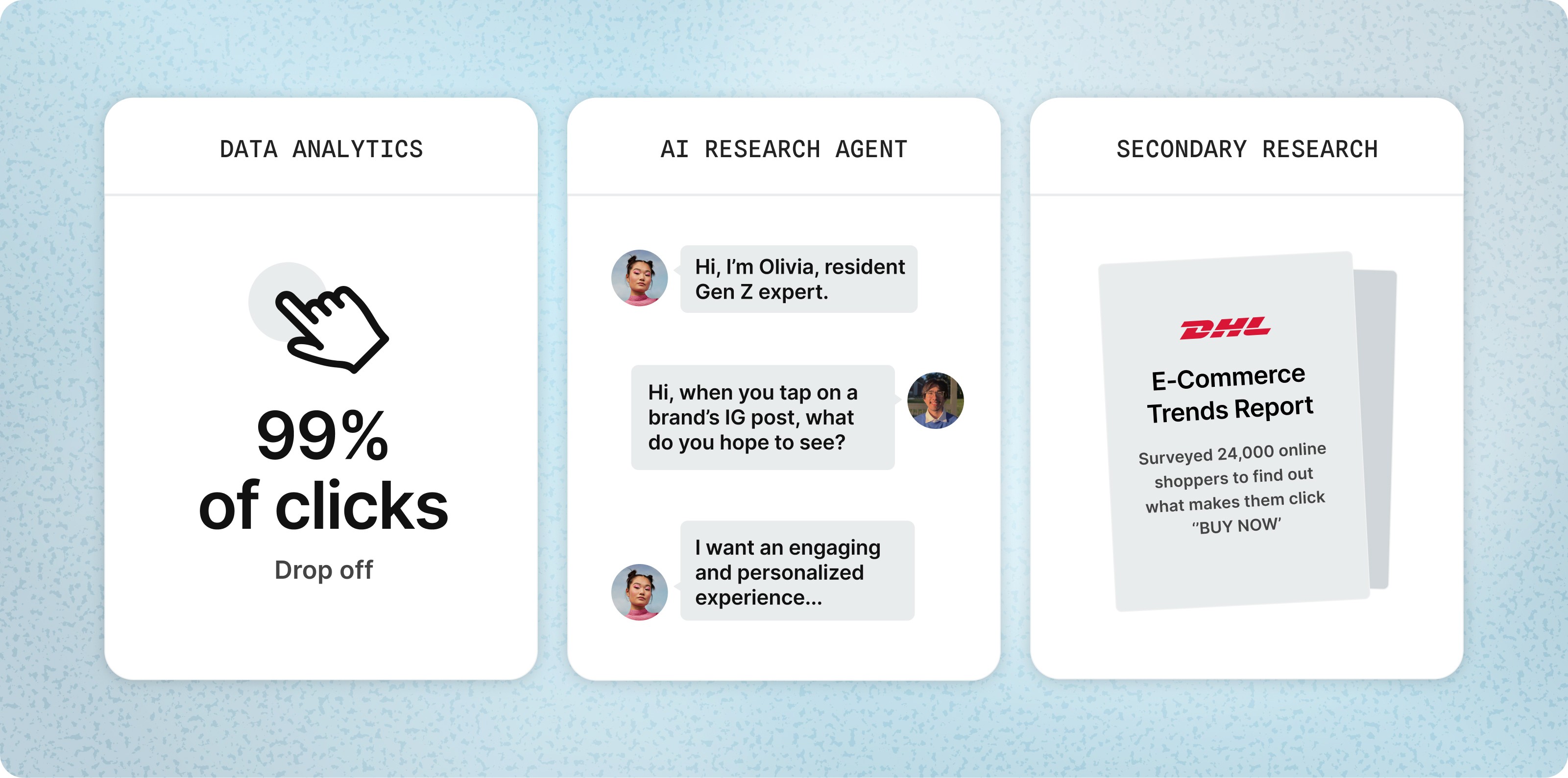 I ran mixed-methods research with the Research and Analytics teams—leveraging data analytics, an AI research agent, and secondary research.
